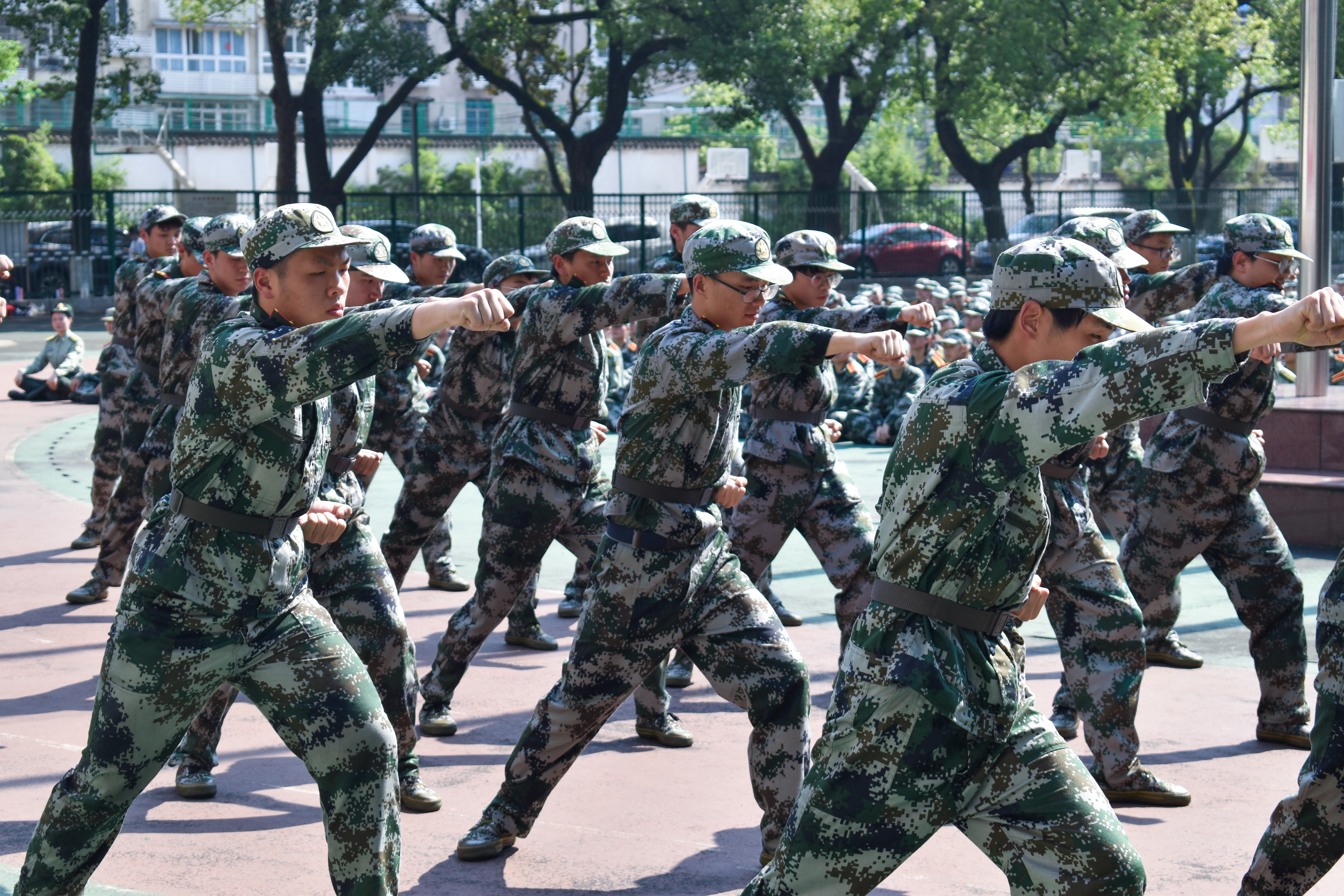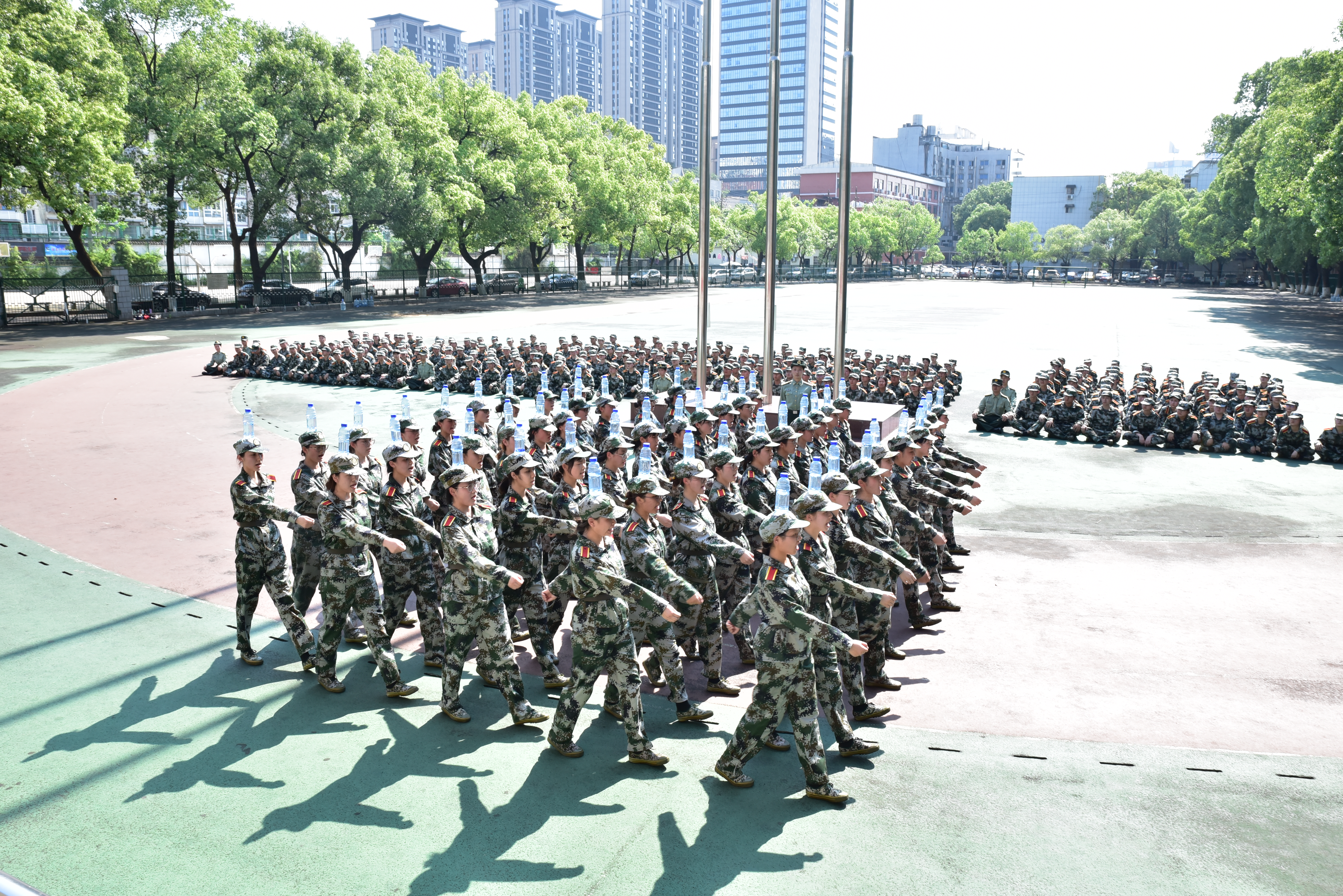 雄壮激昂的国歌响彻校园,鲜艳的五星红旗、校旗院旗迎风招展。庄严的升旗仪式后,队列汇报表演正式开始。7个方队,581名同学,英姿飒爽,斗志昂扬,迈着矫健有力的步伐走过主席台,在主席台前逐一展示六个训练科目,接受学校领导、老师及同学们的检阅,他们站如松,坐如钟,行如风,步伐一致,口号嘹亮,充分展示了良好的精神风貌和丰硕的军训成果,赢得了现场领导、老师和同学们的阵阵掌声。其中50名女生组成的方队头顶水瓶进行各项训练科目展示,转体、正步、蹲下起立,水瓶在头上纹丝不动,展现出极高训练水平;男子方队演示的军体拳如行云流水,刚劲有力,势如破竹,充分展现了男生的力量与气势。
