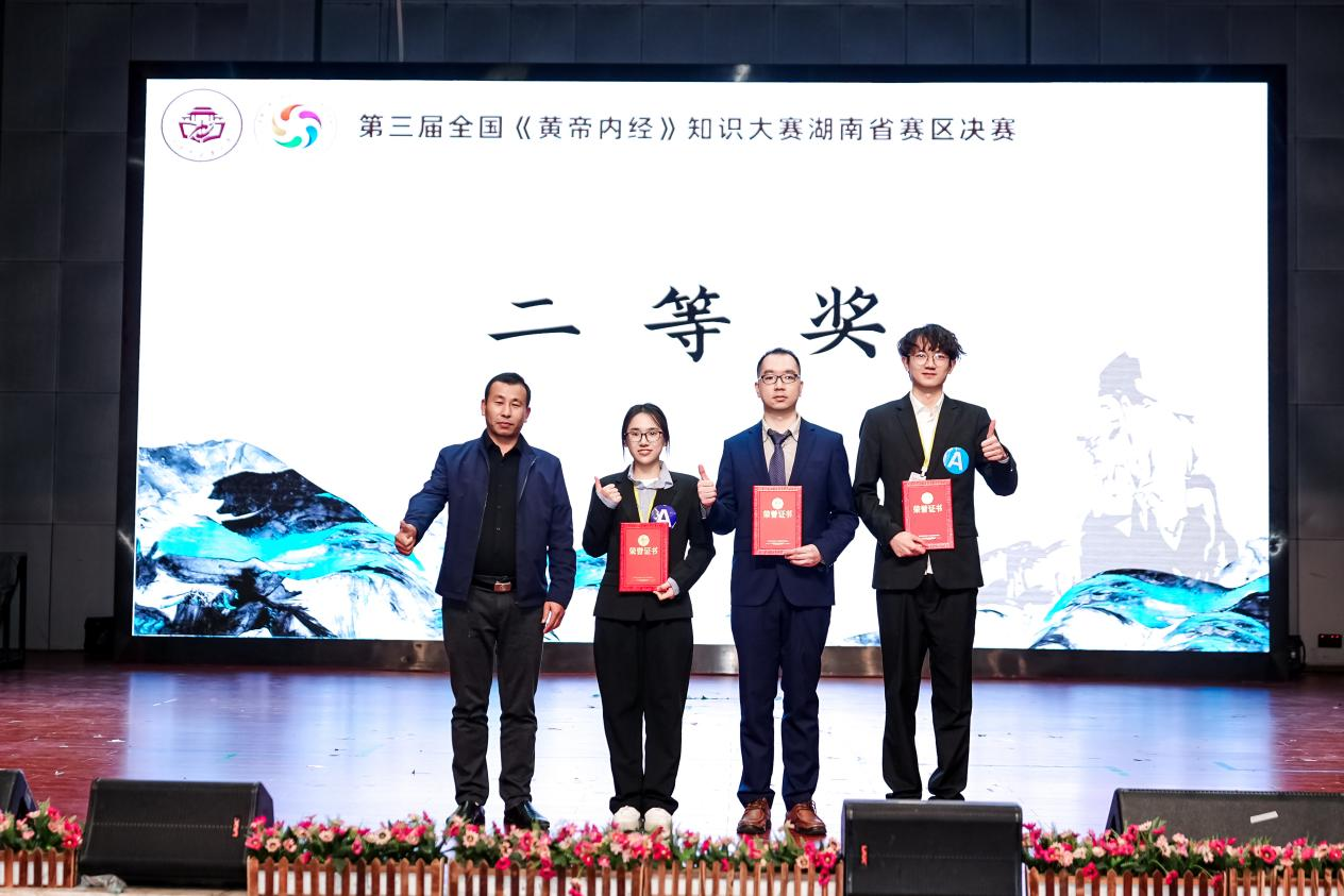 在上午进行的半决赛中,我校两支队伍凭借扎实的知识储备和稳定的临场发挥,在30分钟限时答题模式中排名前八,进入决赛。当晚举行的决赛现场,赛况激烈,设有必答题、抢答题、猜词题、论述题及风险题等多个环节,全面考察选手对《黄帝内经》原文、医理、临床应用及文化内涵的理解深度与广度。比赛中我院两支队伍沉着应对,默契配合,引经据典,对答如流,出色表现赢得了评委与观众的一致好评,最终“杏林之星队”斩获二等奖,“湘杏岐黄队”获得三等奖。