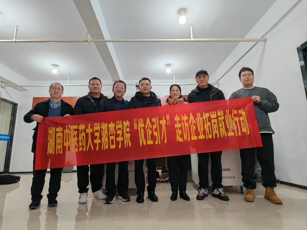 为深入贯彻落实“访企拓岗促就业”专项行动部署,深化产教融合协同育人,精准对接医疗行业人才需求,拓宽毕业生就业渠道,2026年1月26日上午,湖南中医药大学湘杏学院党委书记杨军辉、院长谢辉、党委副书记刘瑞斌、湘杏学院(湘阴校区)教学副院长李云耀带队走访长沙美德力医疗科技有限公司,与企业负责人开展深度座谈交流,共探校企合作新路径。