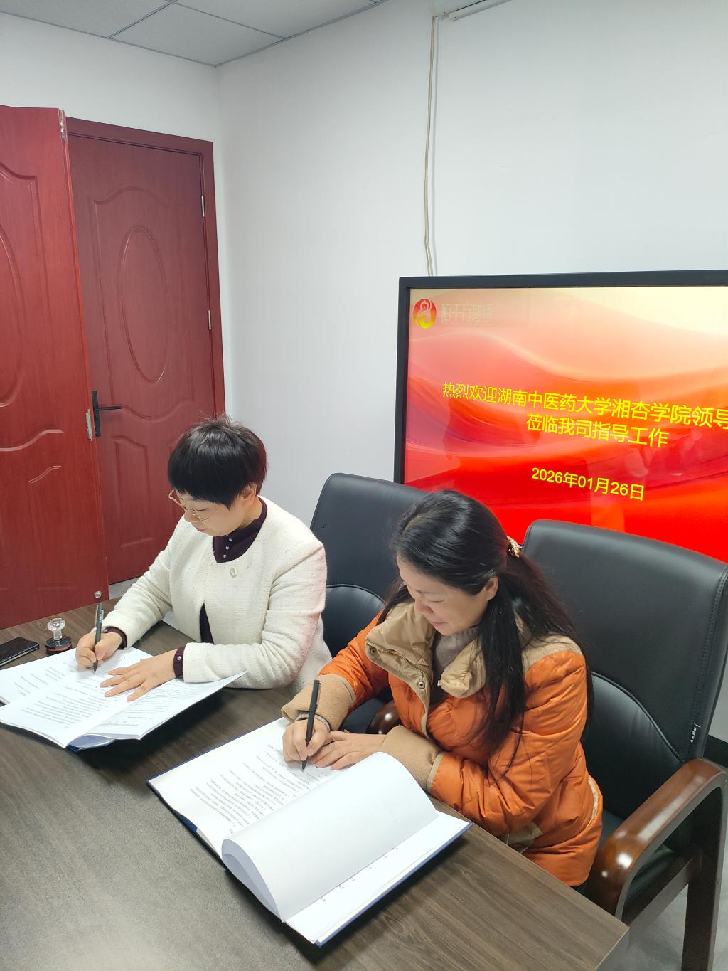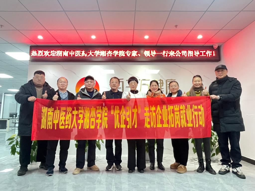 为深入推进“访企拓岗促就业”专项行动,精准对接中医药健康产业人才需求,深化产教融合与产学研协同创新,2026年1月26日下午,湖南中医药大学湘杏学院党委书记杨军辉、院长谢辉、党委副书记刘瑞斌、湘杏学院(湘阴校区)教学副院长李云耀带队走访湖南佰千万健康产业发展有限公司,与企业负责人围绕人才培养、实习就业、科研合作等议题开展深度座谈,共绘校企合作新蓝图。