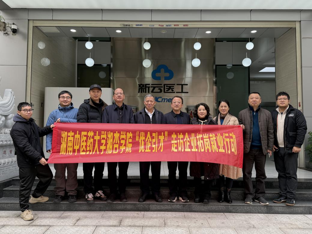 为深入贯彻党中央、国务院关于高校毕业生就业工作决策部署,落实教育部“优企引才”访企拓岗促就业专项行动要求,进一步拓宽市场化社会化就业渠道,2026年1月27日,湖南中医药大学湘杏学院党委书记杨军辉、院长谢辉、副院长贺林、党委副书记刘瑞斌带队开展一日双访活动,先后走访湖南新云医疗装备工业有限公司与九芝堂股份有限公司。