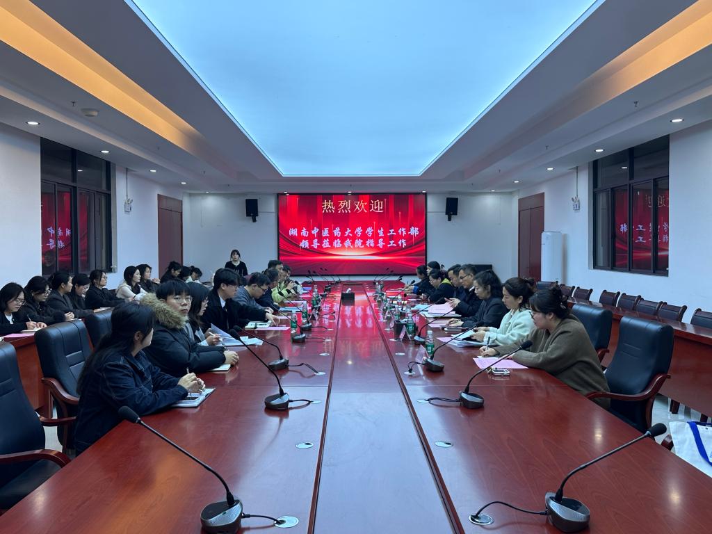 为深入落实立德树人根本任务,强化校院两级学工联动,精准指导学生工作高质量开展,2026年3月25日下午,湖南中医药大学学生工作部部长朱久宜率队赴湘杏学院湘阴校区召开学生工作部例会并开展专题辅导。校学工部副部长王召亿、李玉冰,办公室主任蒋雪,资助中心主任李湘玉,宿管科主任袁惠,思政科朱施琴,心理健康中心石林鹭出席会议。湘杏学院党委书记杨军辉、党委副书记刘瑞斌、湘阴校区学工部部长张毅韬及湘阴校区全体辅导员参加会议。