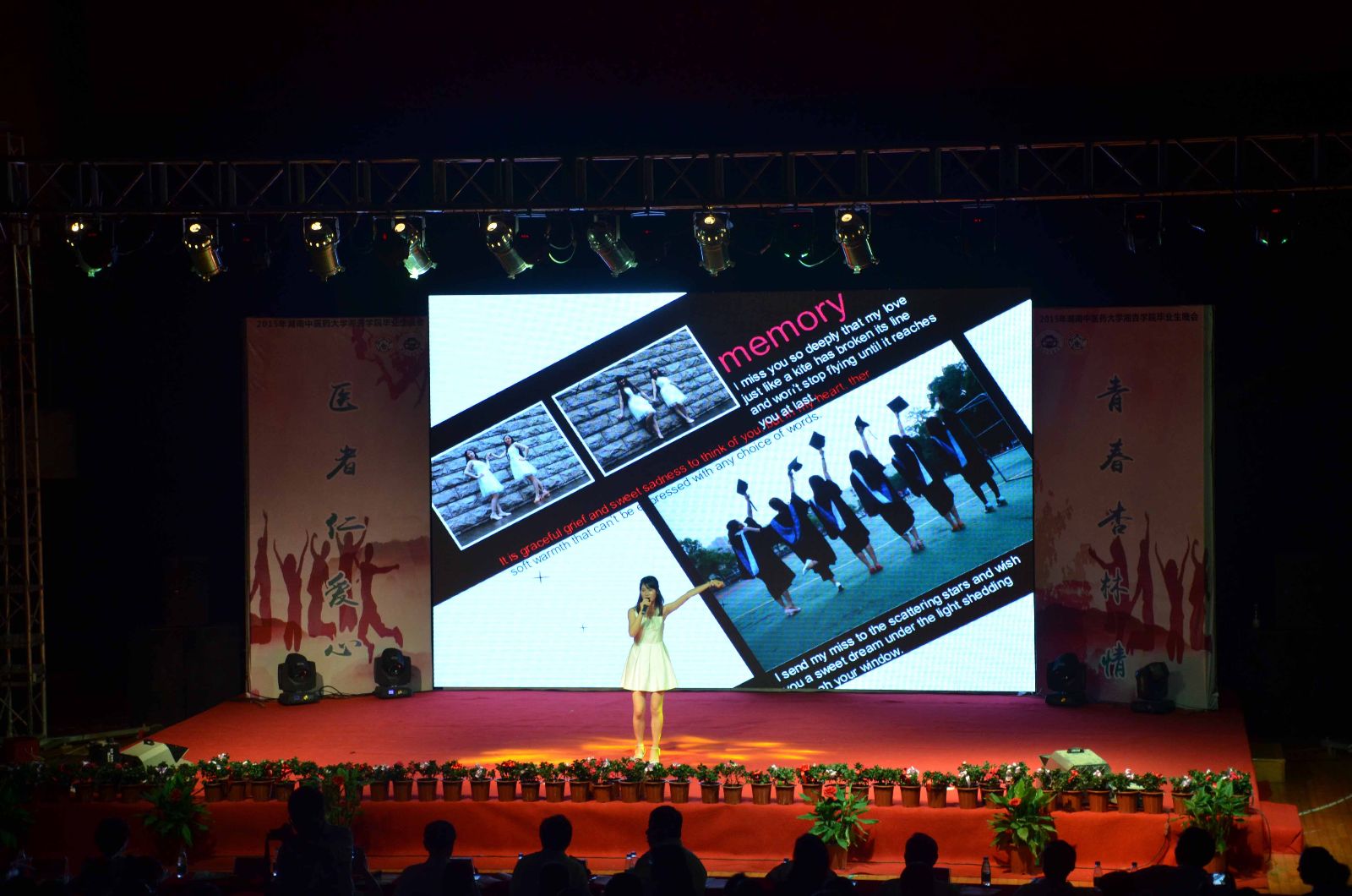 晚会分为“年华追忆,春晖医情”、“同舟湘杏,青春医心”、“医脉相承,一路有你”三个篇章。器乐队与声乐坊共同演奏的《永不再见的青春》演绎了青春的美好,如柳似玉曼妙般的舞蹈《浅花枝》和《落花时节又逢君》,使观众体会到了古韵的美。由毕业生带来的《锦绣中华》让我们感受到了传统养生功法的大气精妙,而不论是励志的《青春不散场》,或者是带着淡淡伤感的《时光里》,都让大家追忆大学的美好年华。毕业生带来的歌曲串烧《那些年那些歌》,东塘校区学生会演绎独特的影子剧《仲夏夜之梦》都透露着湘杏学子对学校的感恩和祝福,毕业生们一段深情的朗诵《我们》,字里行间都透露着浓浓的离情别绪与难忘的校园记忆,离别、感恩之情相互交织,深深触动着现场观众的心。最后,晚会在老师们的深情合唱下完美落幕,他们用歌声与微笑祝福毕业生《明天会更好》,用歌声告诉毕业生,母校永远是他们的家!