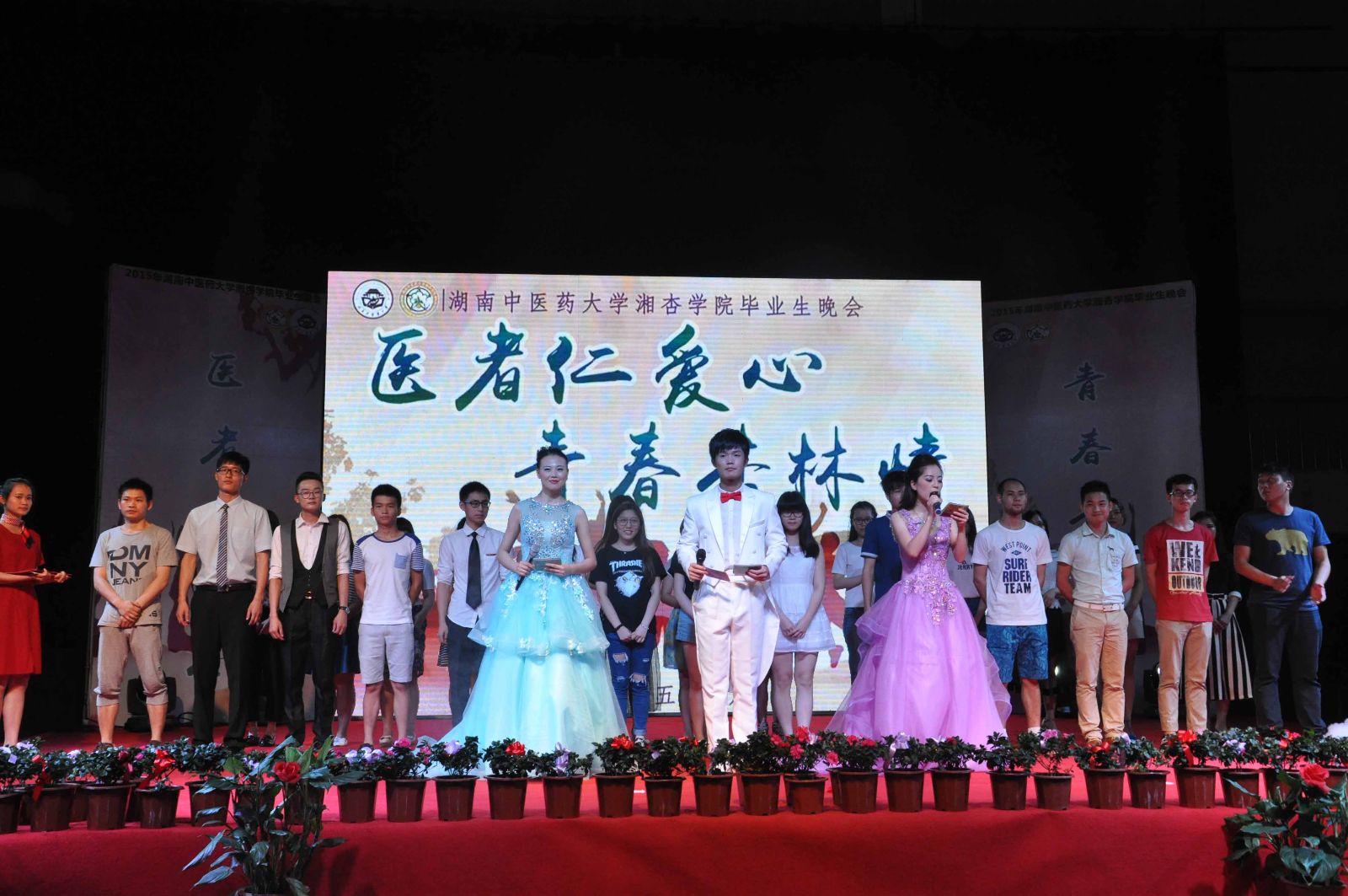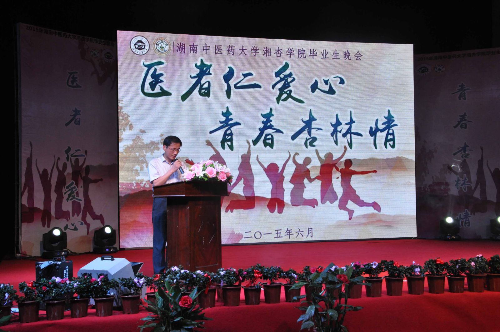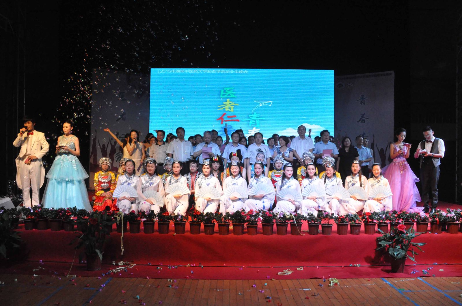 欢声笑语,吹响毕业号角;载歌载舞,镌刻离别思绪。2015年6月6日晚19:00,湖南中医药大学湘杏学院“医者仁爱心,青春杏林情”毕业生晚会在东塘体育馆隆重举行。湖南中医药大学党委副书记、校长廖端芳教授,大学党委委员、副校长、研究院副院长周小青教授,大学党委委员、副校长葛金文教授,学生工作部谭琥部长,章小纯副部长,以及湖南中医药大学校团委方圆副书记,湘杏学院李木清院长,党总支王云辉书记,党总支毛芳武副书记及学院全体老师应邀出席与湘杏学子共同观看本次晚会。