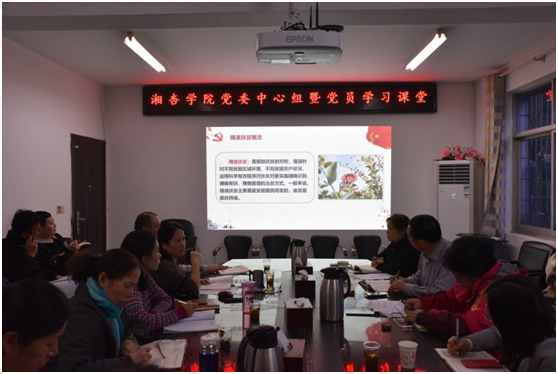 坚决打赢脱贫攻坚战是党的十九大精神,深刻理解习近平总书记脱贫攻坚重要思想,为积极探索特定贫困群众、深入贫困地区多渠道多元化的精准扶贫有重要意义。11月28日下午,湘杏学院党委中心组暨党员学习课堂在学院会议室举行,学习交流习近平总书记精准扶贫重要思想,党委书记王云辉主持,党委副书记、院长谢辉专题授课,学院全体教职工党员参加会议。