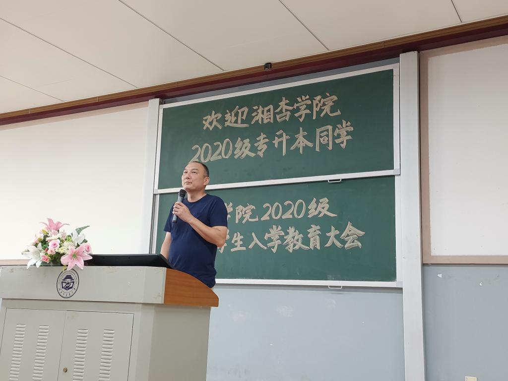 2020年9月5日上午9点,湘杏学院2020级专升本学生新生入学教育大会在含浦校区举行,本次大会邀请到湘杏学院党委副书记毛芳武老师出席,教务科科长易展老师、学生科科长刘瑞斌、张毅韬和全体专升本新生到场参与。