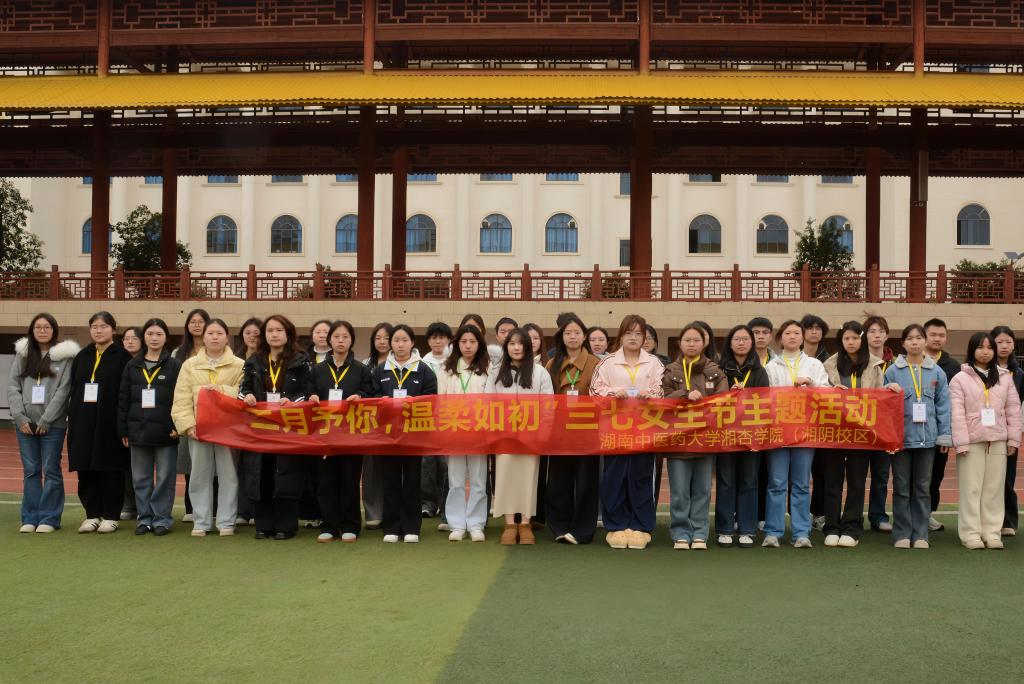 春意渐浓,芳华绽放。为丰富校园文化生活,营造关爱女生的温馨氛围,展现新时代女大学生积极向上的精神风貌,湖南中医药大学湘杏学院(湘阴校区)于 2026 年 3 月 7 日下午两点半在田径场开展了“三月予你,温柔如初”三七女生节主题活动。全院在校女生齐聚一堂,共赴这场春日之约。