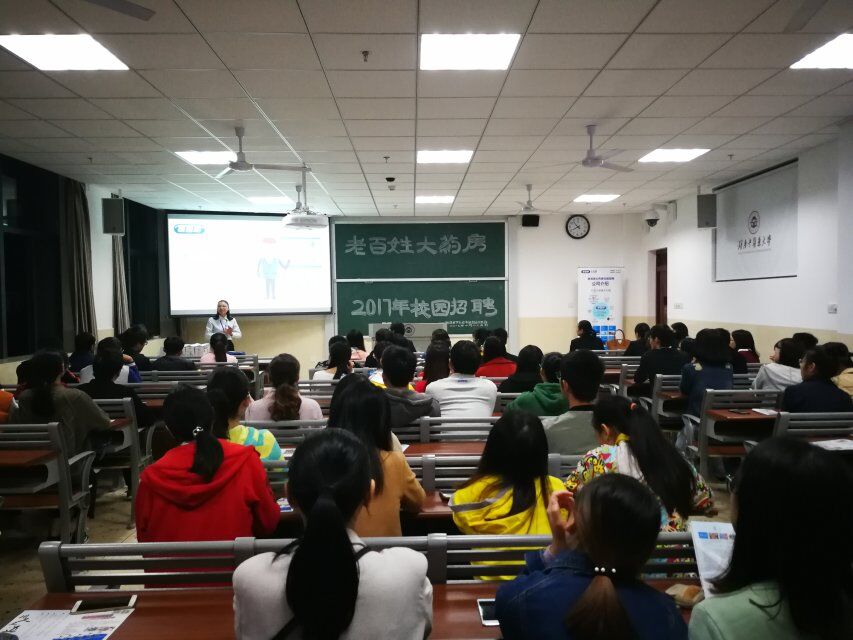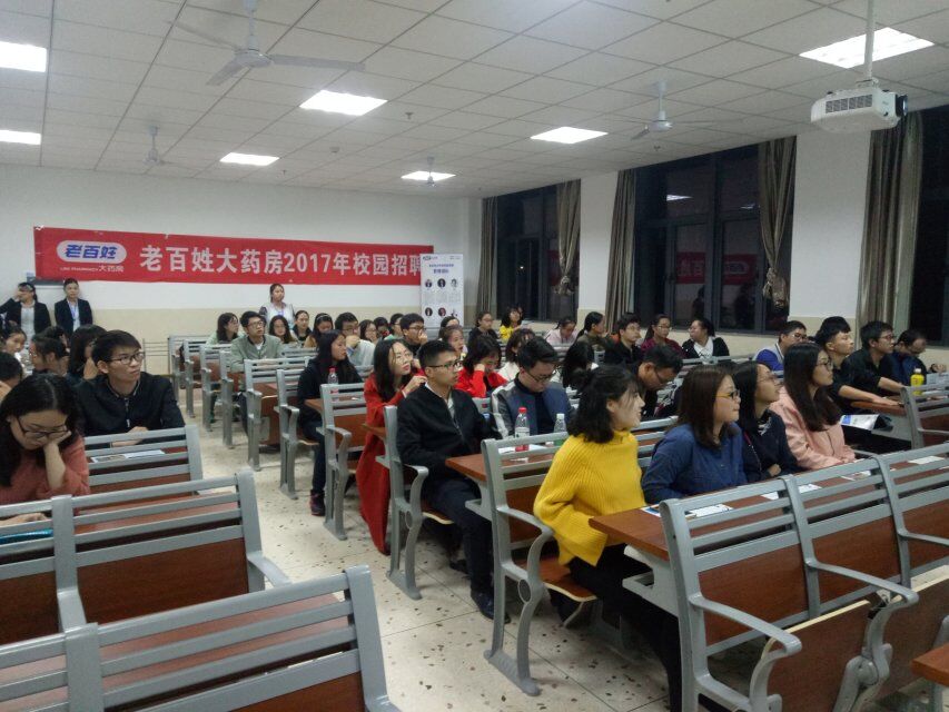 为吸收新血液、培养“90后经理”,老百姓药房公司招聘宣讲会于2017年10月23日晚19:30在湘杏学院含浦校区第三教学楼3310教室举行,我院药类、管理类大四学生及部分药学院大四学生积极参加了本次招聘会。