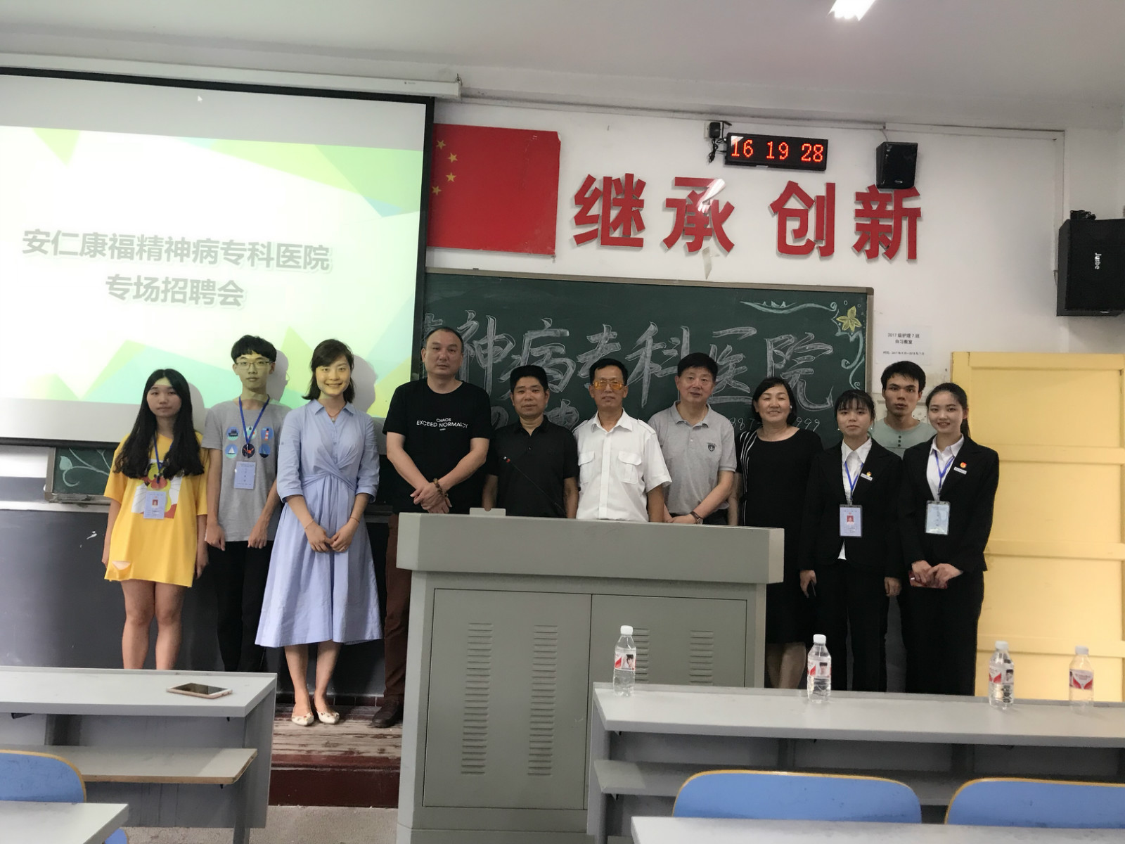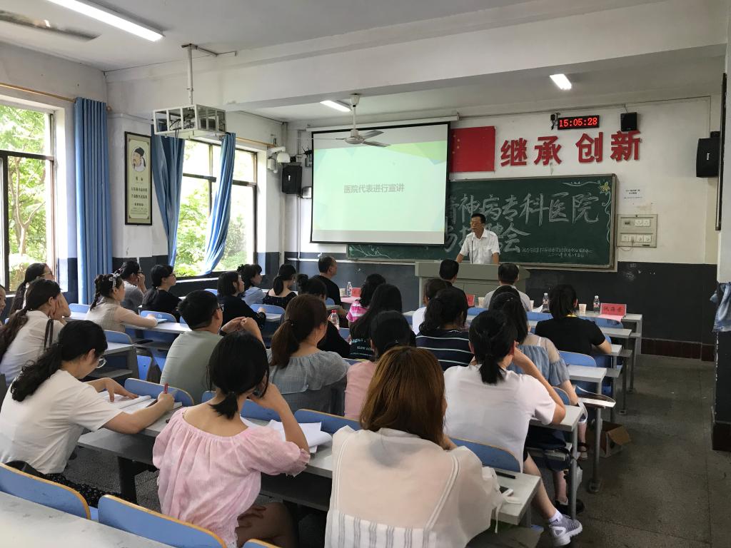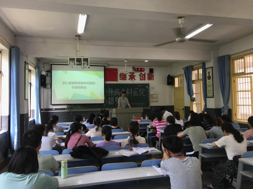 2018年5月25日下午,郴州市安仁康福精神病专科医院专场招聘会在湖南中医药大学湘杏学院教学楼11教室成功举行。参会专家团队由医院院长苏国太、特聘名誉院长陈鸣辉、医疗指导专家张宏耕、护理指导专家仇海荣组成。湘杏学院党委副书记毛芳武、学生科陈露老师及2018届毕业生参加了本次招聘会。