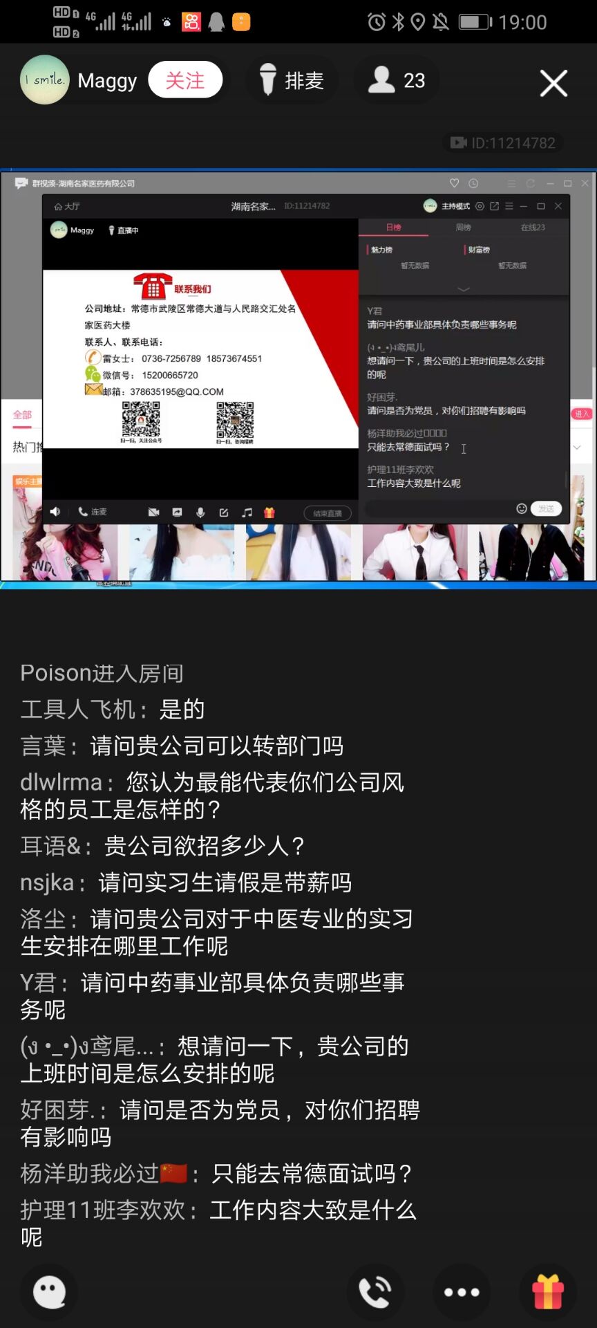 湖南名家医药集团是一家集药品、医疗器械设备批发和医药电子商务、健康医疗移动互联网服务等产业发展与一体的大型现代化医药经营企业。集团招聘负责人以ppt的形式,将公司风貌、工作环境、员工团建等介绍给同学们,并向同学们阐述了公司积极的企业文化及入职后的发展前景。同学们积极参与,在直播间与负责人频繁互动,希望为自己找到合适的就业岗位。